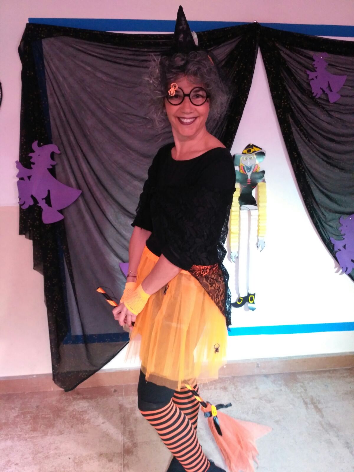 Para unirnos un poco a la temática del centro" las brujas" los niños/as trajeron a clase una brujita para decorar los pasillos y las seños de Infantil decidimos prepararles un teatro de brujitas. La seño Luisa se encargó de su invención y seño Helena y Sole eran las brujitas Mirta y Marta, Ana la mamá brujita, Maribel la técnico de audio, Merche la narradora y yo era la brujita abuela.